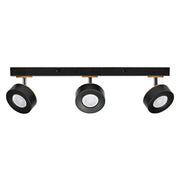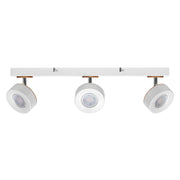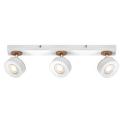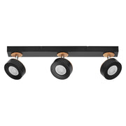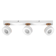 Tämä valaisin on kolmiosainen kattospotti, jossa yhdistyvät moderni muotoilu ja luonnonmateriaalit. Valaisimen runko on pitkä, suorakaiteen muotoinen, musta tai valkoinen. Siinä on kolme suunnattavaa, pyöreää mustaa tai valkoista valopäätä. Jokaisen valopään ja rungon välissä on tyylikäs puinen yksityiskohta, joka tuo kokonaisuuteen lämpöä ja kontrastia. Valaisin sopii hyvin moderneihin ja skandinaavisiin sisustuksiin, ja se toimii erityisesti tiloissa, joissa tarvitaan tehokasta ja suunnattavaa valaistusta, kuten keittiössä, eteisessä tai työtiloissa. Ei himmennettävä.