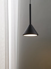 Tämä valaisin on pelkistetyn tyylikäs ja moderni, muodoltaan selkeästi kartiomainen. Musta mattapinta antaa sille elegantin ja teollishenkisen ilmeen. Valaisin on varustettu pitkällä varrella, joka korostaa sen siroa ja linjakasta muotoilua.