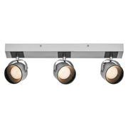 Tämä kolmihaarainen kohdevalaisin tuo tehokasta ja suunnattavaa valoa moderniin tai teollishenkiseen sisustukseen. Valaisimessa on kolme metallista, harjattua sylinterimäistä spottivaloa, joissa on musta sisäpinta tuomassa syvyyttä ja tyylikästä kontrastia. Jokainen valopää on säädettävä, joten valaistusta voi kohdistaa eri suuntiin esimerkiksi keittiössä, eteisessä tai olohuoneessa. Pitkulainen kattokiinnike viimeistelee yksinkertaisen, mutta näyttävän kokonaisuuden. Ei himmennettävä.