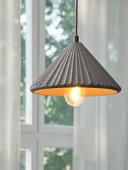 Tämä riippuvalaisin edustaa teollista tyyliä modernilla otteella. Valaisin on valmistettu betonista, mikä antaa sille jämäkän ja minimalistisen ilmeen. Kartionmuotoinen varjostin on koristeltu hillityillä uurteilla, jotka tuovat pinnalle kiinnostavaa rytmiä ja tekstuuria. Ei himmennettävä.