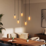 Tämä on teollistyylinen riippuvalaisin, jossa on kiiltävän musta metallinen valaisinkanta ja kangaspäällysteinen musta johto. Valaisin tuo sisustukseen rouheaa ja modernia ilmettä, ja se sopii erityisesti koristeellisten filamenttilamppujen kanssa käytettäväksi. Erinomainen valinta esimerkiksi keittiöön, ruokapöydän ylle tai osaksi trendikästä loft-henkistä sisustusta.