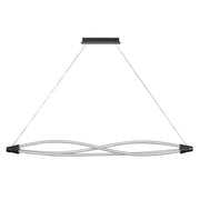 This is a modern, futuristic pendant lamp with a unique, open design. The lamp consists of two or more bent, white or silver-colored tubular structures that intertwine in the middle to form a slightly spiral, airy whole. The lamp hangs from the ceiling with two thin wires attached to a rectangular bracket. This lamp is well suited to minimalist and modern spaces where a striking and sculptural lighting solution is desired. Dimmable.