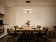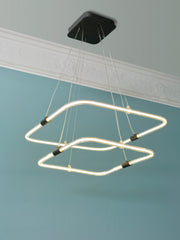 This is a modern pendant lamp with two rectangular LED light rings. The rings are of different sizes and hang at different heights from a black ceiling bracket on steel wires. The lamp gives off a soft and evenly distributed light. Its minimalist and geometric design fits well with modern, Scandinavian or industrial interiors. It is both stylish and functional for a dining room or living room, for example. Dimmable.