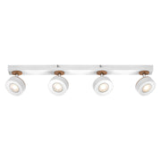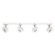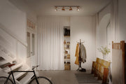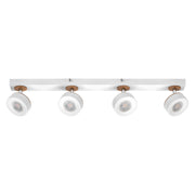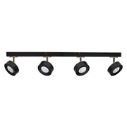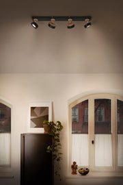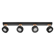 This luminaire is a four-light ceiling spotlight that represents a modern and minimalist design. Four round, directional light heads are attached to a long, rectangular black frame. The light heads are black, with a light source in the middle. The contrast of black and white is softened by stylish cork details between the light heads and the frame, which bring warmth and a natural look to the whole. This luminaire is a practical and impressive choice for, for example, a living room, kitchen or hallway, where efficient and versatile lighting is needed. Not dimmable.