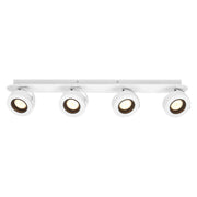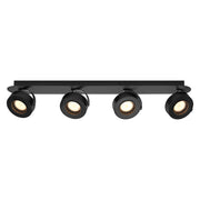 This is a four-light, black ceiling spotlight with a modern, industrial style. Each round light head has a visible lattice-like structure on the inner rim, giving it a turbine-like look. The lamp heads are adjustable, so you can focus the lighting as you wish.