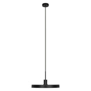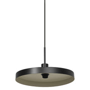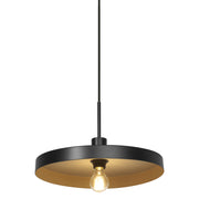 This lamp is a distinctly different style from the previous ones. It is a simple, industrial-style pendant lamp with a wide, low, and round shade. The shade is black on the outside, and the inside looks like a warm gold or copper shade, creating a soft and warm light. This lamp is perfect for above a dining table or kitchen island, for example, and combines modern minimalism with traditional design in a stylish way. Not dimmable.
