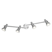 This is a four-light ceiling-mounted spotlight. It has two articulated rods with a total of four adjustable spotlights attached to them. The material of the lamp is brushed metal, and its design is clean-lined and modern.
