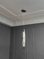 Kyseessä on moderni, futuristinen riippuvalaisin, jossa on ainutlaatuinen, avoin muotoilu. Se koostuu useista ohuista, valkoisista tai hopeanvärisistä putkimaisista elementeistä, jotka kiertyvät toistensa ympäri muodostaen elegantin ja ilmavan rakenteen. Valaisin roikkuu katosta yhdellä ohuella johdolla, joka on kiinnitetty pyöreään kattokiinnikkeeseen. Tämä minimalistinen ja moderni valaisin sopii hyvin esimerkiksi käytävään, eteiseen tai pienempään tilaan, jossa halutaan tyylikäs ja veistoksellinen valonlähde. Himmennettävä.
