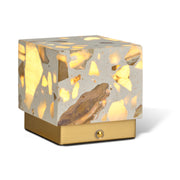 Tämä kuutionmuotoinen pöytävalaisin yhdistää mosaiikkibetonin luonnonläheisen estetiikan ja modernin teknologian. Valaisimen elävä pinta syntyy vaaleista kivimurskeista, joiden läpi valo siivilöityy pehmeästi ja tunnelmallisesti. Alumiininen messinkipohja tuo kokonaisuuteen ripauksen ylellisyyttä, ja kosketustoiminnolla säädettävä valaistus tekee käytöstä vaivatonta.