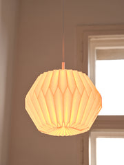 Tämä paperista valmistettu riippuvalaisin tuo tilaan lempeän, mutta ryhdikkään tunnelman. Pyöreähkö, jalokivimäinen muoto on muodostettu tarkasti laskostetusta paperista, mikä antaa valaisimelle veistoksellisen ilmeen. Varjostimen kuviointi tuo esiin valon ja varjon hienostuneen leikin, ja sen läpi siivilöityvä valo luo lämpimän ja rauhoittavan ilmapiirin.